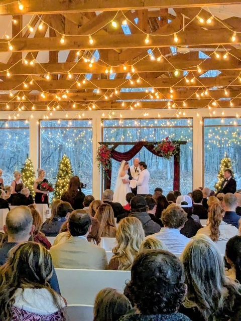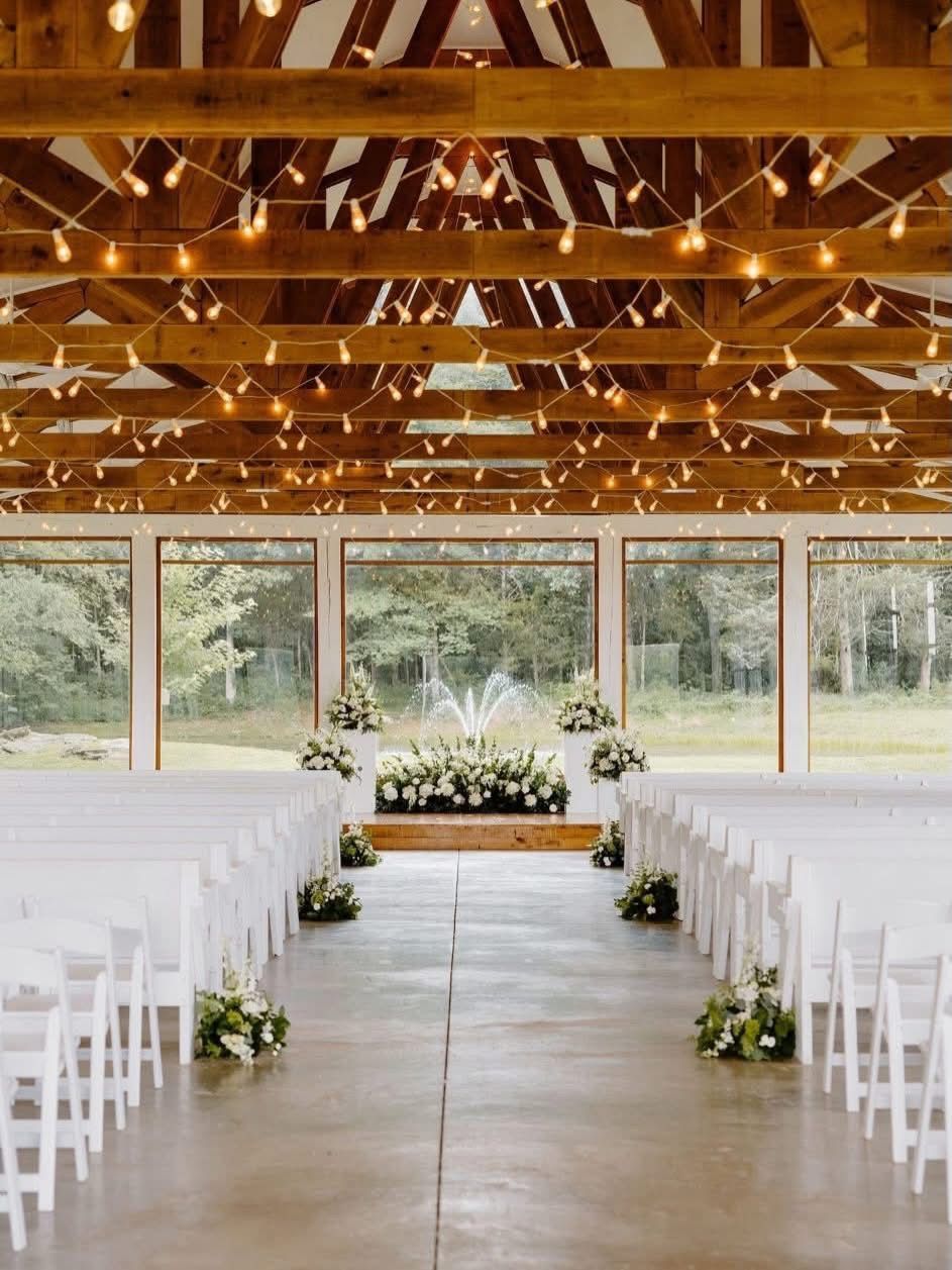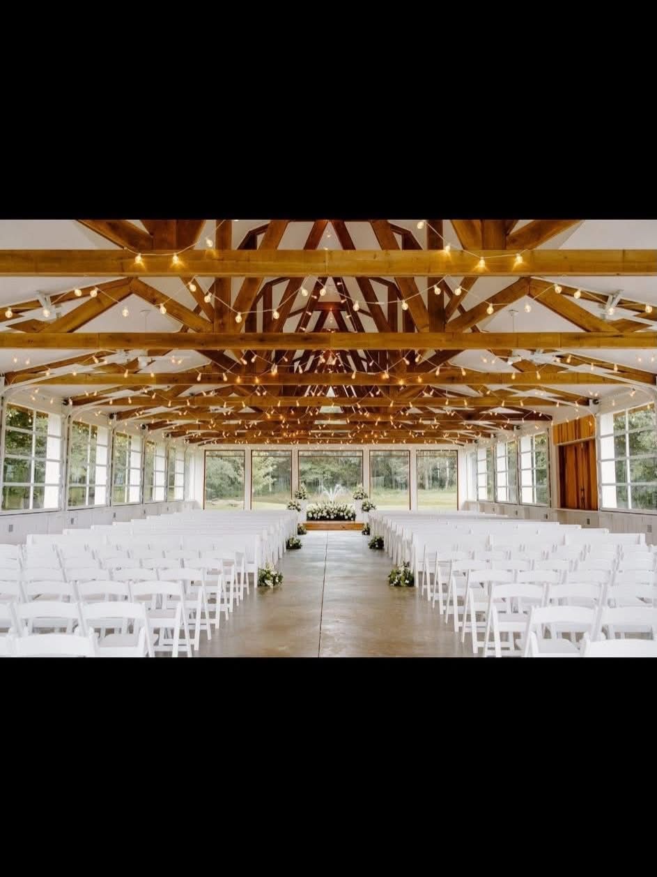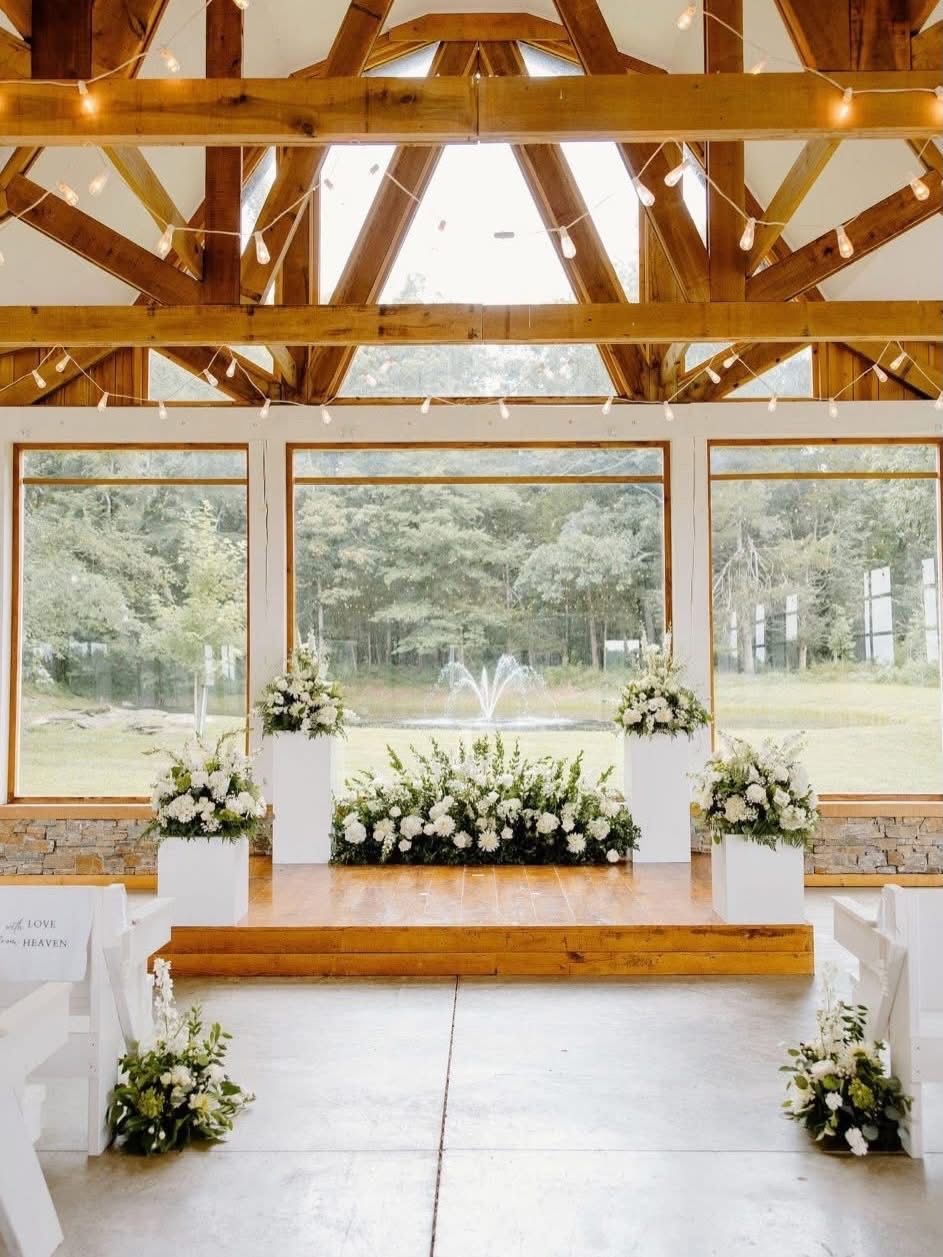 The White Magnolia speaks nature and elegance. Windows and glass line the side and end walls. The Magnolia is climate controlled. If you prefer an open air feel, the side windows slide up and out of sight. Overhead lights abound, and line the arching ceiling. The wooden oak platform serves to elevate the bride and groom. Choose the backdrop of your choice or you may prefer the fountain and forest in the background. White pews offer seating for your guests. A gorgeous setting for a gorgeous wedding